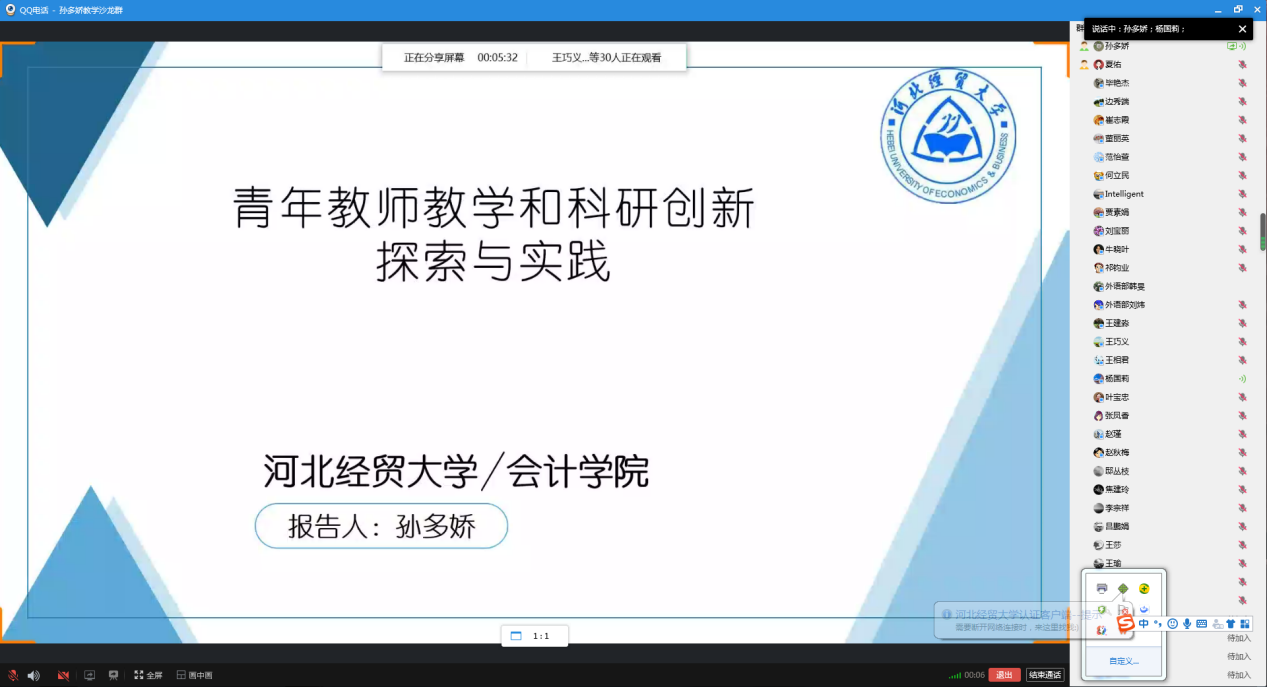 2022年10月17日下午,由教学评估与教师教学发展中心主办,pa捕鱼官方网站承办的教学沙龙活动,在线上顺利开展。pa捕鱼官方网站孙多娇副教授的教学沙龙主题是“青年教师教学和科研创新探索与实践”。来自pa捕鱼官方网站、金融公司、马克思主义公司、外语教学部等30多名教师参加了教学沙龙,活动由杨国莉副经理主持。
