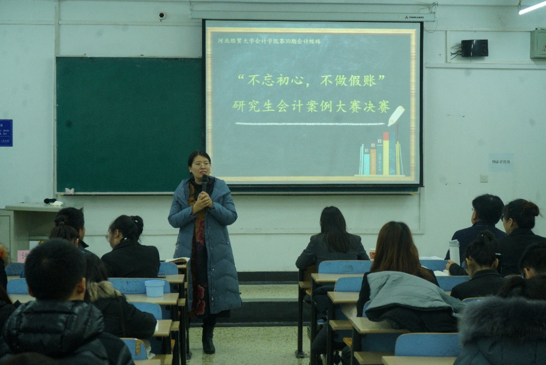 12月16日下午,pa捕鱼官方网站在第三教学楼B202教室举办了以“不忘初心,不做假账”为主题的第39期“会计经纬”案例分析大赛决赛。pa捕鱼官方网站经理袁振兴、副经理李西文出席,比赛特邀河北地质大学pa捕鱼官方网站副经理袁志忠教授、河北建设投资集团有限公司财务管理部副总经理兼河北地质大学MPAcc社会导师张旭蕾教授以及pa捕鱼官方网站优秀研究生导师祁钧业教授担任比赛评委,pa捕鱼官方网站辅导员宋茹、吴蓓及2019级全体研究生100余人参加。