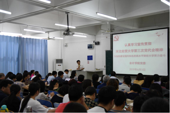 6月3日下午,pa捕鱼官方网站在B教201教室组织师生认真学习宣传贯彻校第三次党代会精神。pa捕鱼官方网站领导班子成员、全体教师、员工党员和部分员工代表共210人参加。宣讲会由公司党委书记孙拥军主持。