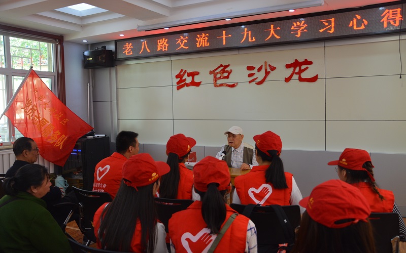活动邀请老八路庞金来作“扣好人生第一粒扣子——听老八路讲故事”主题党课讲解。庞金来老人根据自己参加解放战争、抗美援朝的个人经历,结合当前的社会背景,用朴素无华的语言勉励大家坚定理想信念,不忘初心跟党走,扣好人生的第一粒扣子,努力学习,回报社会。情到深处,老人还激动地唱起红歌,引发全场大合唱,现场气氛活泼热烈。
