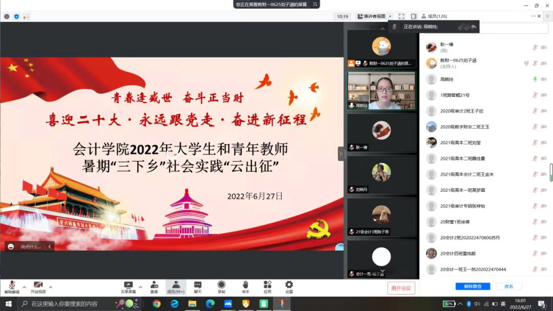 6月27日下午,pa捕鱼官方网站2022年暑期社会实践“云出征”仪式正式启动。院团委书记周晓玲出席,社会实践各小分队成员及团支书共计125名同学参与。