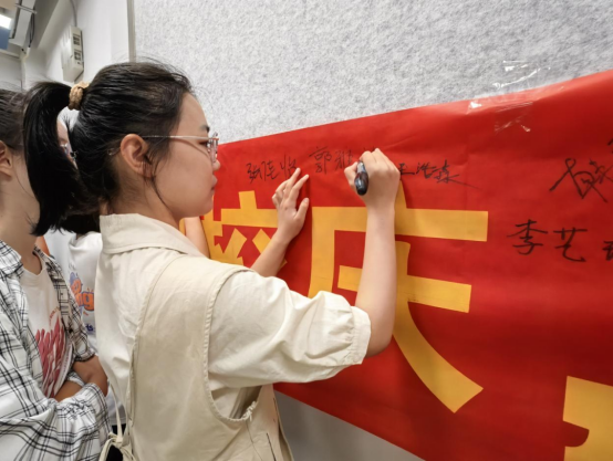 大会第三项,由领誓人尚泽毅带领全体同学进行宣誓,优秀员工代表于横幅前签字立誓。铮铮誓言,字字千钧,一字一句,皆是会院学子创建优良学风的信念与决心,一言一行,全是会院学子激励自我成长的压力与动力。