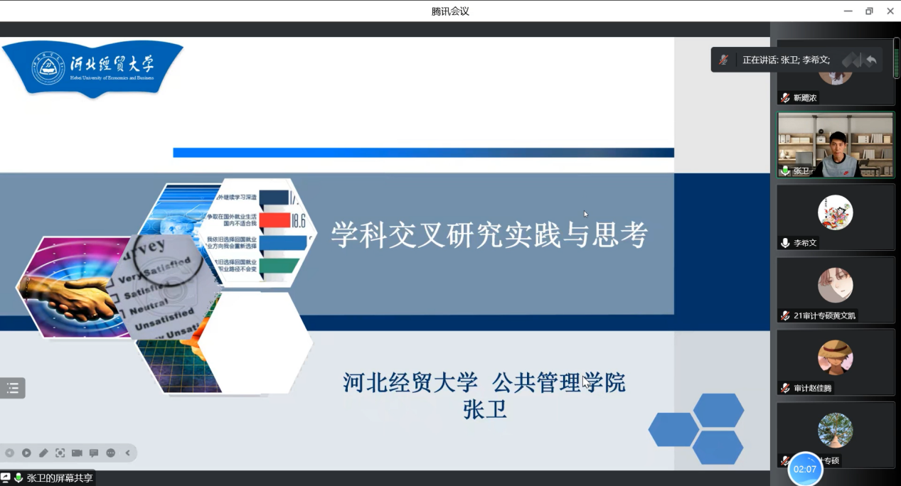 2022年11月12日下午,PA捕鱼官网入口公共管理公司硕士生导师张卫副教授应pa捕鱼官方网站邀请,通过腾讯会议平台为师生们做题为《学科交叉研究实践与思考》的学术报告,张副教授曾主持中国博士后基金项目、河北省教育厅青年拔尖人才项目等4项,参与国家重点研发项目、国家自然科学基金项目以及国土资源部项目5项,发表研究论文20余篇,其中SCI收录6篇,SSCI收录2篇,并于2020年获“青年五四奖章”荣誉称号。pa捕鱼官方网站副经理李西文主持此次学术报告,部分研究生导师,科研秘书韩冰以及21级、22级pa捕鱼官方网站全体研究生参加本次报告。