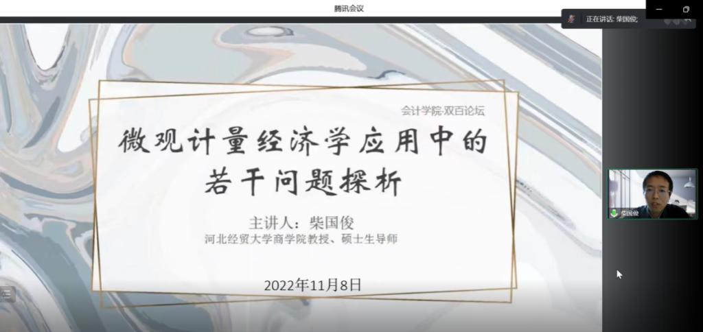 2022年11月8日上午,柴国俊教授应pa捕鱼官方网站邀请,通过腾讯会议平台为同学们作题为《围观计量经济学应用中的若干问题探析》的报告。pa捕鱼官方网站副经理李西文、科研秘书韩冰及全体研究生参加本次学术报告。