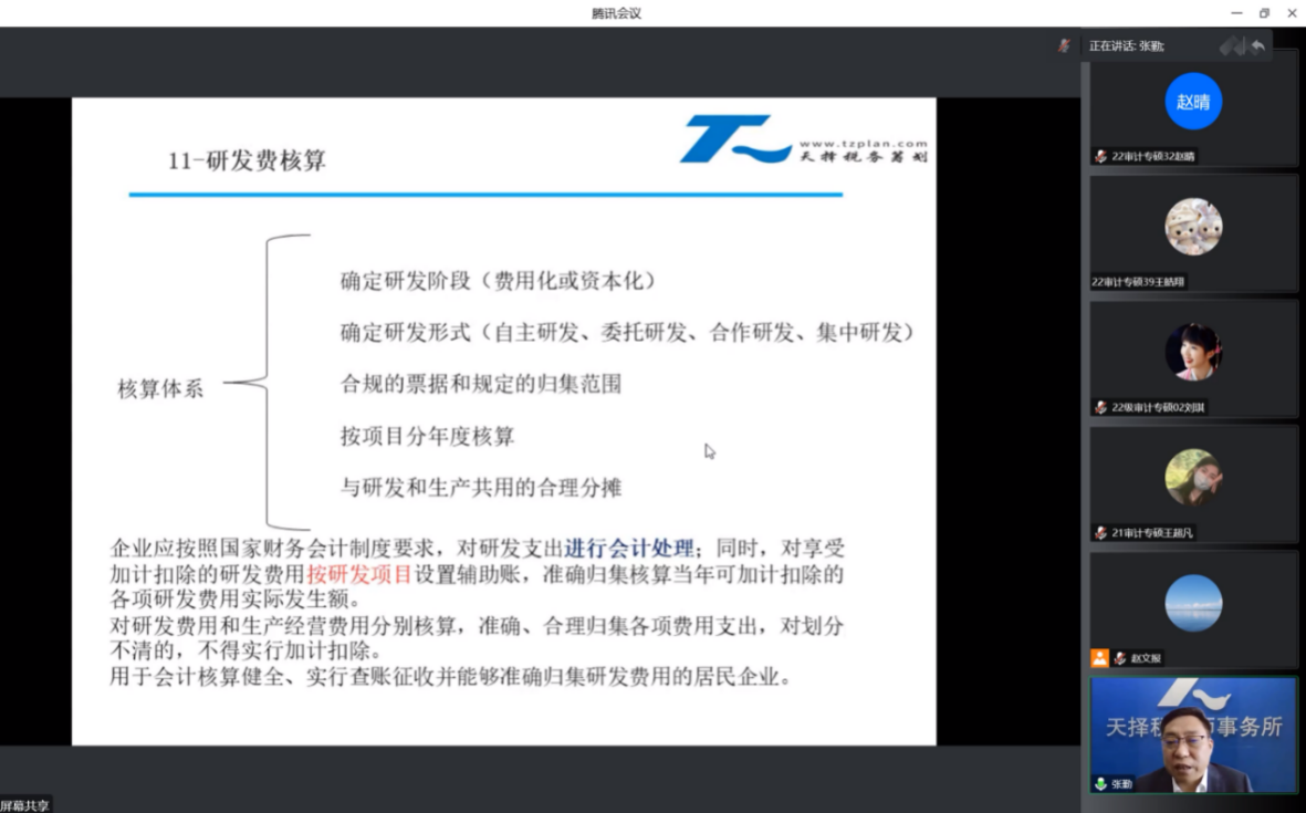 2022年10月7日上午,天择税务师事务所河北分所总经理张勤应pa捕鱼官方网站邀请,通过腾讯会议为师生们做题为《研发费用加计扣除理论与实操问题探究》的主题报告。党委书记赵文报主持此次讲座,科研秘书韩冰、部分导师以及21级、22级pa捕鱼官方网站全体研究生参加本次讲座。
