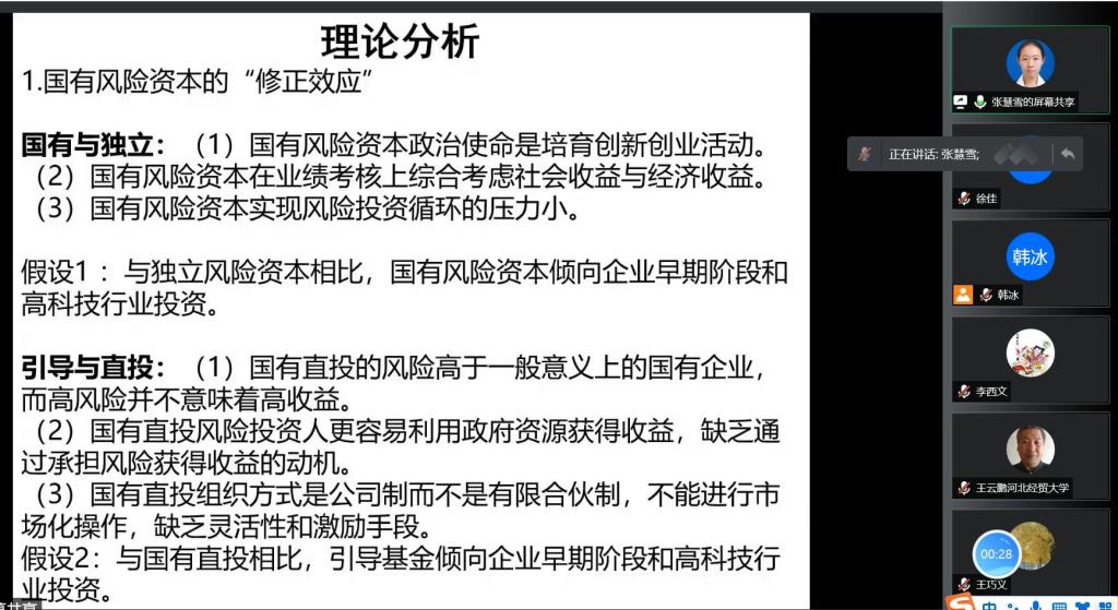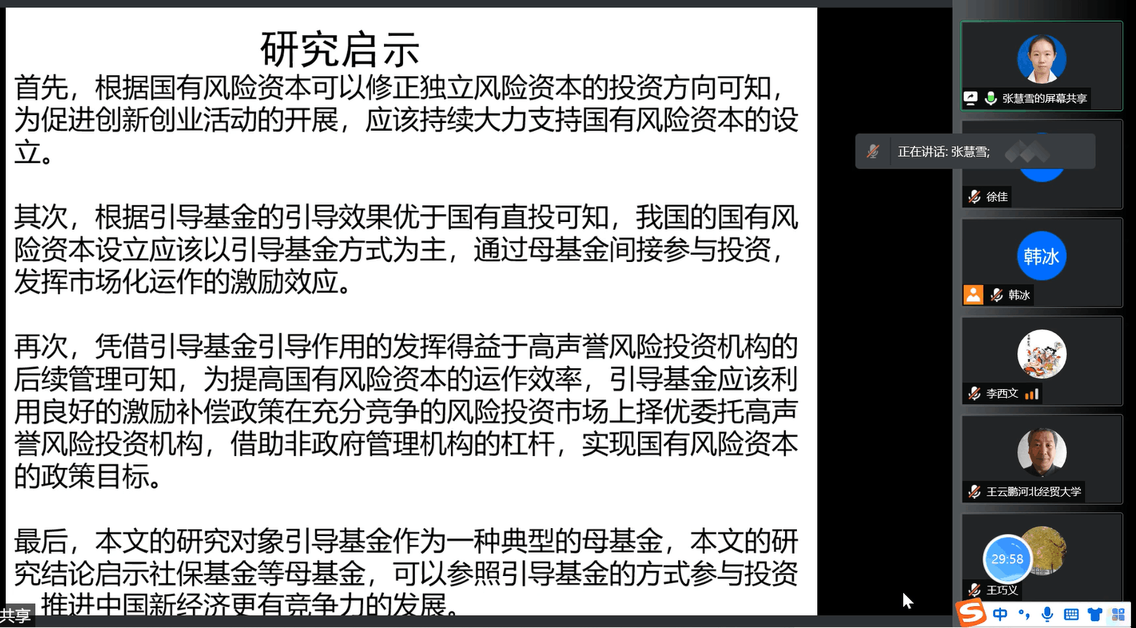 2021年12月12日上午,南开大学与新南威尔士大学联合培养博士张慧雪应pa捕鱼官方网站邀请,通过腾讯会议平台为老师们和同学们作题为《政府引导基金对企业创新的影响研究——基于风险投资机构异质性视角》的报告。经理袁振兴、副经理李西文、科研秘书韩冰老师及部分骨干老师和pa捕鱼官方网站20、21级研究生参加本次讲座。