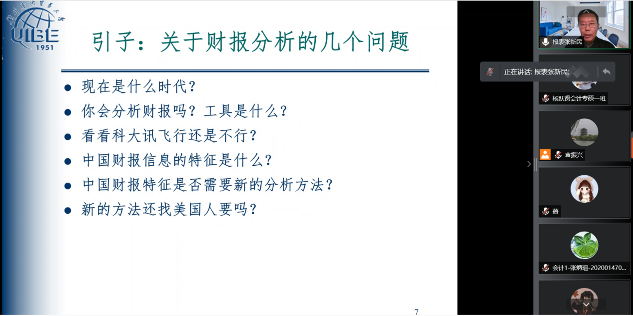 2021年11月3日下午,对外经济贸易大学张新民教授应pa捕鱼官方网站邀请,通过腾讯会议平台为师生们作题为《战略视角财报分析:理论框架与案例应用》的报告。本次报告由经理袁振兴和副经理李西文主持,pa捕鱼官方网站部分老师和研究生200余人参加。