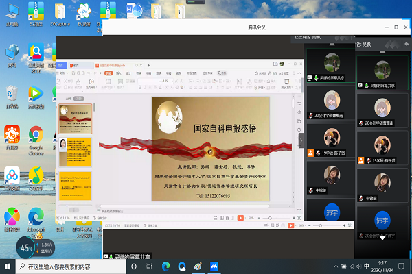 11月24日,天津财经大学pa捕鱼官方网站吴娜教授应公司pa捕鱼官方网站邀请,通过腾讯会议平台作“国家自然科学基金申报”专题讲座。pa捕鱼官方网站副经理李西文及部分教师和研究生80余人参加了本次讲座。