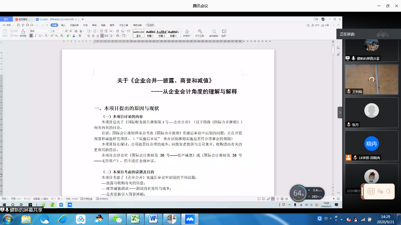 2020年9月21日下午,中国人民大学商公司耿建新教授应pa捕鱼官方网站邀请,通过腾讯会议平台为同学们作题为《企业合并——披露、商誉和减值》的报告。副经理李西文及pa捕鱼官方网站全体研究生共200余人参加本次讲座。